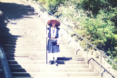 さて、お四国を歩くに際して最も気を使ったのは、衣体(服装)である。全体のスタイルは、黒衣、白作務衣、輪袈裟、手甲、脚絆(きゃはん)、網代傘(あじろがさ)、錫杖(しゃくじょう)、スニーカー、黒のリュックサック、頭陀袋(ずだぶくろ)を身に着ける。